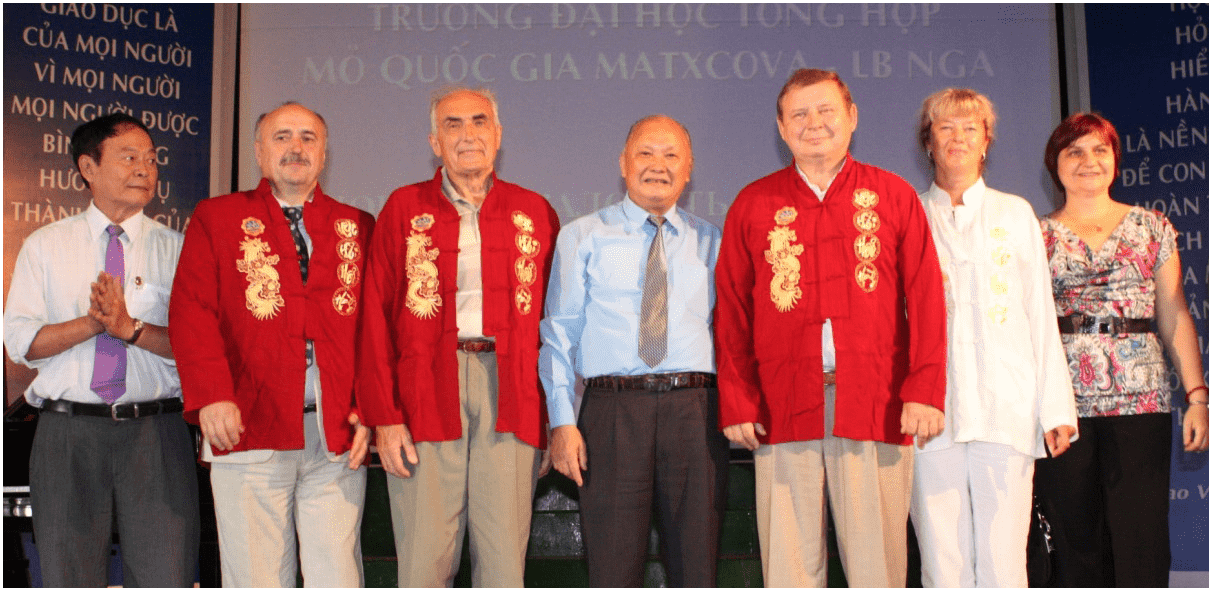 GS.VS Gulyaev Y.V - Chủ tịch Viện Hàn lâm Khoa học Công nghệ Liên Bang Nga chúc mừng GS.VS Cao Văn Phường – Hiệu trưởng được tặng Huân chương vàng Kendusơ dành cho các nhà khoa học có nhiều công nhận.